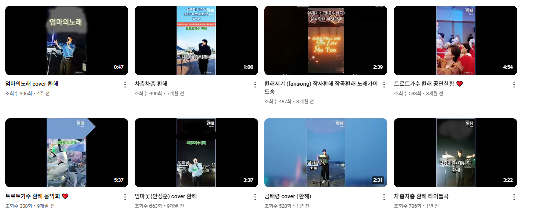 그 외에도 환해는 노사연의 ‘바램’, 임영웅의 ‘별빛 같은 나의 사랑아’, 장민호의 ‘남자는 말합니다’ 등 유명 트로트 곡을 자신만의 스타일로 커버한 영상과 버스킹 무대를 유튜브 채널을 통해 공개하고 있습니다. 이러한 활동은 그의 무대 경험과 감성 표현 능력을 대중에게 알리는 역할을 하고 있으며, 라이브 방송과 공연에서 꾸준히 선보이고 있습니다.