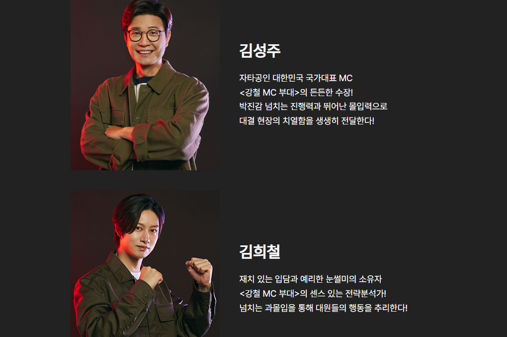 MC로는 김성주, 김희철, 김동현, 츄, 장은실, 최영재가 출연하며, 이들은 참가자들의 전투 상황을 중계하고, 그들의 심리적 변화를 분석해 재미를 더합니다. 또한, 마스터로는 최영재, 안웅태, 채병덕, 박민형 등 실제 군 출신 전문가들이 등장해 참가자들의 능력을 평가하고 조언을 아끼지 않습니다.