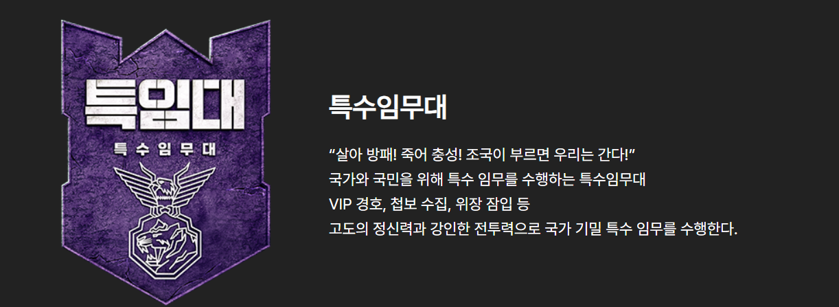 특전사, 707, 특임대, 육군, 해군, 해병대 등 각 부대 출신의 참가자들이 출연해 경쟁을 벌이며, 각 부대의 특성을 살린 전략과 전술이 돋보이는 미션들이 시청자들의 긴장감을 높이고 있습니다.