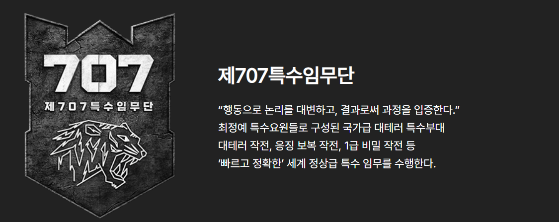 제707특수임무단, 줄여서 707이라 불리는 이 부대는 대한민국의 대테러 특수부대로 세계적으로도 높은 평가를 받고 있습니다. "행동으로 논리를 대변하고, 결과로 과정을 입증한다"는 이들의 신념은 빠르고 정확한 작전을 실행하는 능력에서 잘 드러납니다.