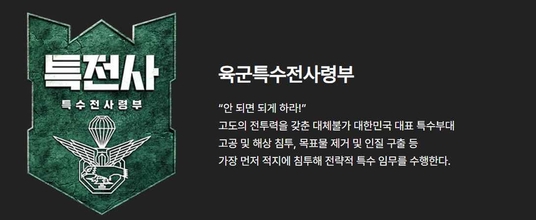 육군특수전사령부, 흔히 특전사로 불리는 이 부대는 "안 되면 되게 하라"는 구호로 잘 알려져 있습니다. 특전사는 대한민국을 대표하는 특수부대로서 고공 침투와 해상 침투는 물론, 목표물 제거 및 인질 구출 등 다양한 전략적 특수 임무를 수행합니다.