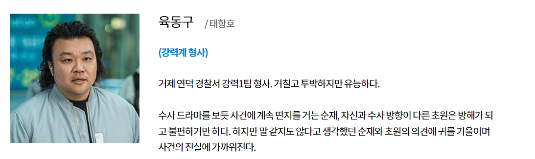 거제연덕경찰서 강력1팀 형사입니다. 육동구와 함께 사건 해결을 위해 힘씁니다.