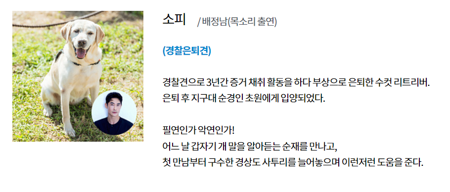 거제도에서 은퇴한 경찰견 소피를 만나게 되고, 소피의 목소리가 들리기 시작하면서 미스터리한 사건들에 휘말리게 됩니다. 이순재는 소피와 함께 사건을 해결해나가는 과정에서 웃음과 감동을 선사할 예정입니다.