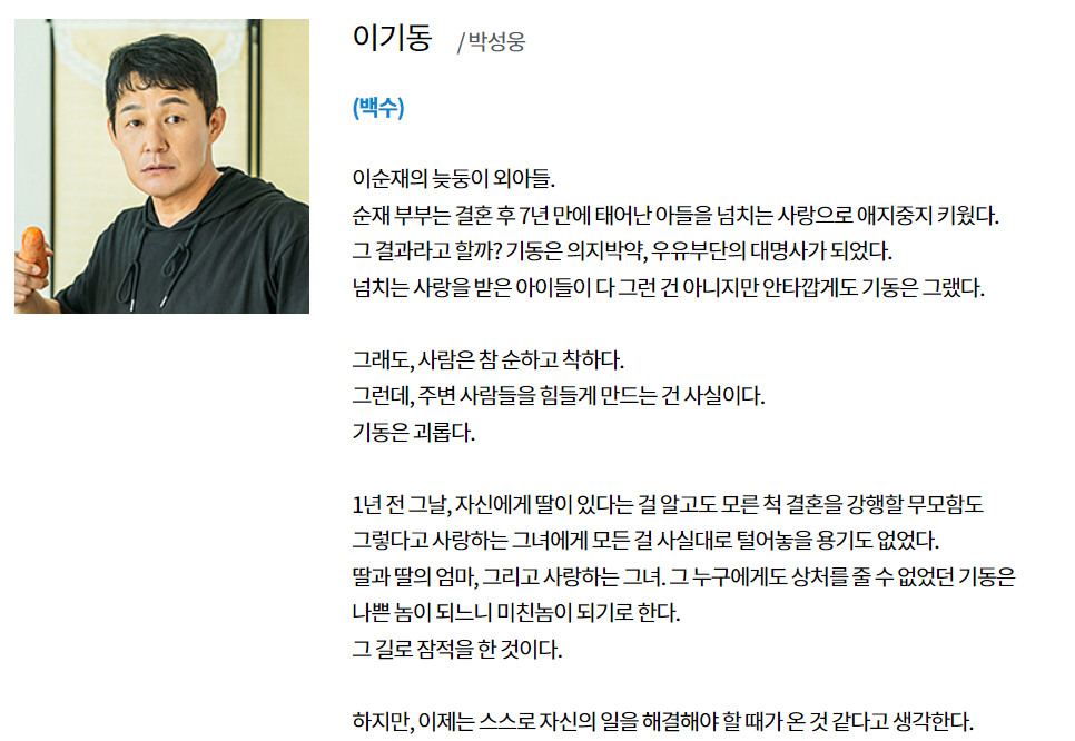 국민 배우 순재의 늦둥이 외아들입니다. 순하고 착한 성품을 지녔지만, 말 못 할 사정 때문에 거제도에 정착하여 아버지 순재를 피해 다닙니다. 아버지와의 관계 회복이 드라마의 중요한 내용 중 하나입니다.