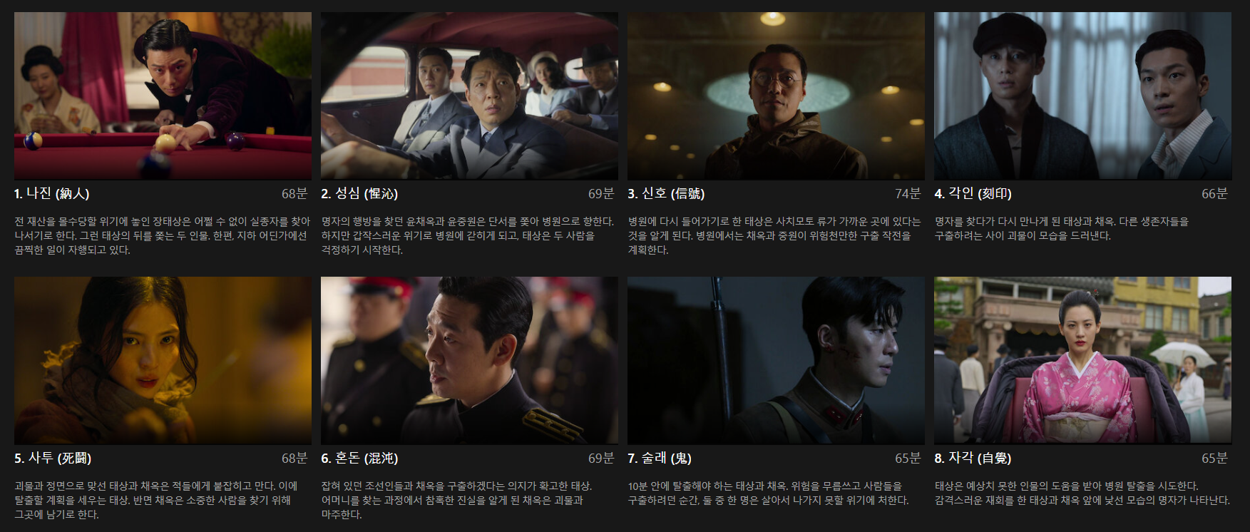 이러한 장르적 요소들이 어우러져 긴장감과 흥미를 동시에 자아냅니다. 경성크리처 시즌1은 총 10부작으로 구성되어 있으며, 총 러닝타임은 692분에 달하였습니다.