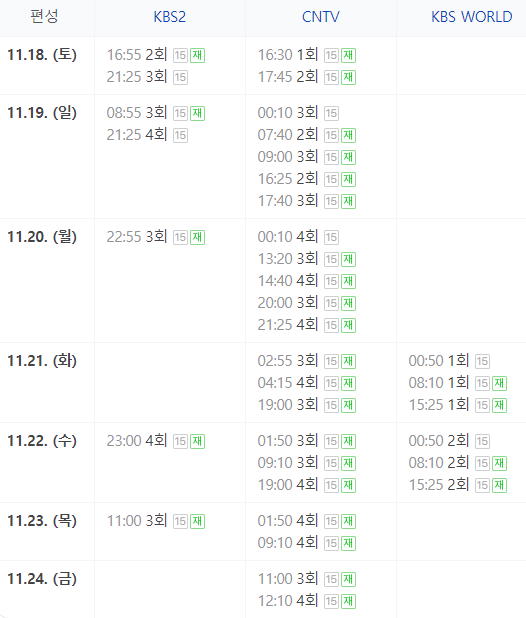 혹은 티비 편성표를 확인 하신후에 재방송을 시청하시면 됩니다. KBS2, CNTV, KBS WORLD, KBS 드라마등을 통하여 재방송 될 예정입니다.