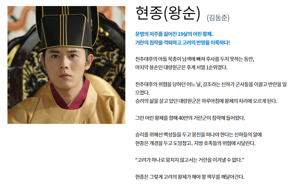 현종 역할은 배우 김동준님이 맡았습니다. 현종은 고려의 제8대 대왕이며 거란과의 전란속에서 성장한 왕입니다.