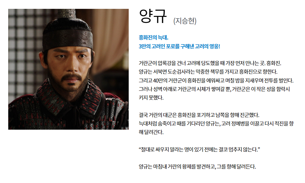 양규 장군은 고려의 영웅으로서 거란군이 진격하여 쳐들어 올때에 용감하게 맞서 싸워 고려를 지켜낸 영웅입니다. 특히 곽주성 전투가 유명하며 드라마의 핵심적인 역할을 하는 대표적인 인물입니다.