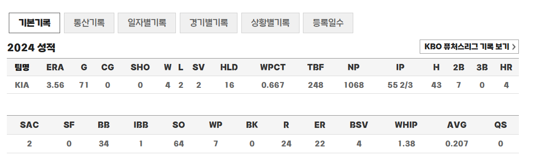 2024년 올 시즌 정규시즌 66경기에 출전하여 66이닝을 소화하며 19홀드를 기록하는 등 팀의 정규시즌 우승에 기여하였다는 좋은 평가를 받았습니다.