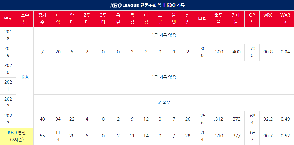특히, 꾸준히 출전 기회를 얻으며 경험을 쌓았고, 중요한 순간에 활약하며 미래 주전 포수로서의 가능성을 보여주었습니다. 2023 시즌은 한준수 선수가 성공적인 복귀와 함께 미래를 향한 희망을 보여준 의미 있는 시즌이었습니다.