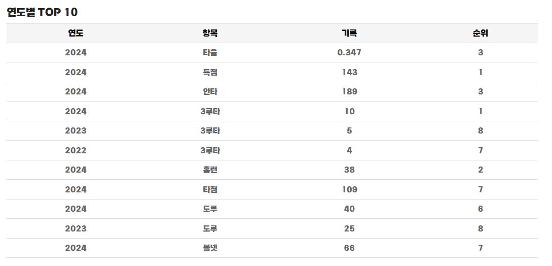 특히 장타력에서 두각을 나타냈으며, IsoP(순장타율)와 장타율에서 역대급 성적을 기록했습니다. 기복 없는 타격 성과는 그가 프로 3년 차에 접어든 선수로서 이룬 놀라운 업적 중 하나였습니다.