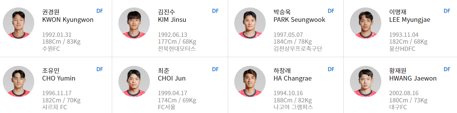 권경원 (수원 FC), 박승욱 (김천 상무), 조유민 (샤르자 FC), 하창래 (나고야 그램퍼스), 김진수 (전북 현대), 이명재 (울산 현대), 황재원 (대구 FC), 최준 (FC 서울)입니다.