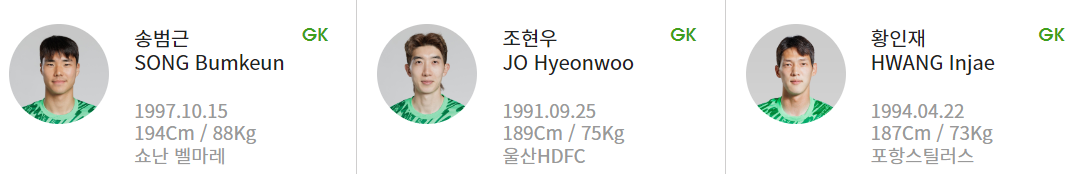 조현우 (울산 현대), 송범근 (쇼난 벨마레), 황인재 (포항 스틸러스)입니다.