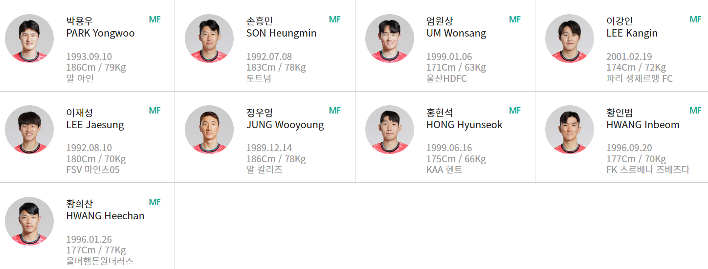 박용우 (알 아인 FC), 정우영 (알 사드 SC), 황인범 (츠르베나 즈베즈다), 홍현석 (KAA 헨트), 이재성 (1.FSV 마인츠 05), 손흥민 (토트넘 홋스퍼 FC), 황희찬 (울버햄프턴 원더러스 FC), 엄원상 (울산 현대), 이강인 (파리 생제르맹 FC)입니다.