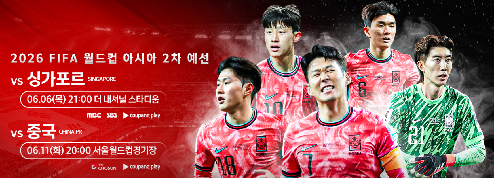 싱가포르 국립경기장에서 싱가포르와 6월6일 저녁 21시에 경기를 치르고 서울월드컵경기장에서 11일 20시에 경기 일정입니다.