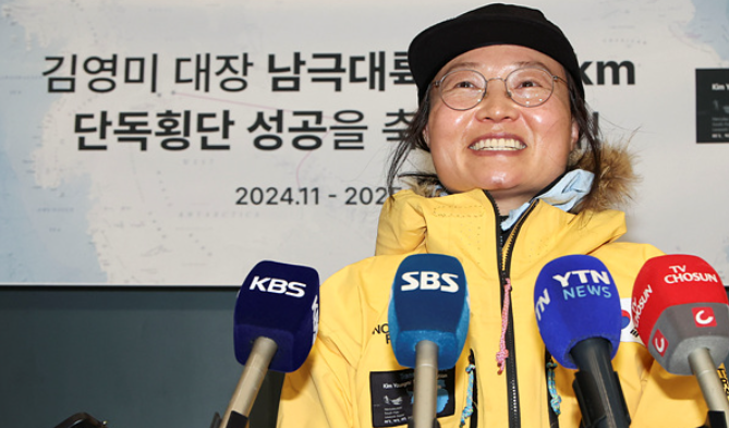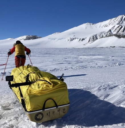 또한 김영미 대장은 한국인 최초로 1700km 거리의 남극 대륙을 단독 횡단한 산악인입니다. 100kg이 넘는 썰매를 끌고 두 다리만으로 남극을 정복한 것입니다.