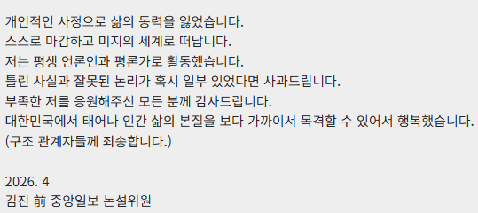 이와 함께, 김진 전 위원의 유서가 4월 13일께 공개되면서 그의 사망에 대한 해석이 한층 구체화되었습니다. 유서에서 그는 “개인적인 사정으로 인해 삶의 동력을 잃었다”는 표현을 남겼습니다.