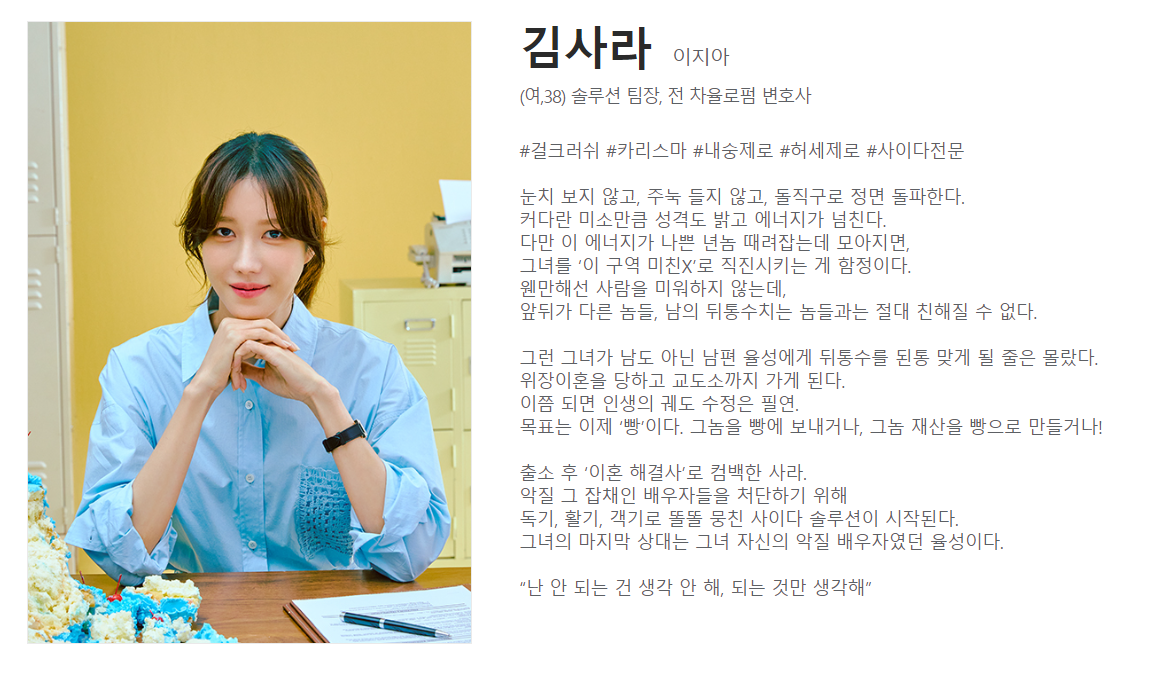 위장이혼으로 시련을 겪지만 이혼 해결사로 변신하여 다양한 문제들을 해치우며 마지막 전 남편을 향한 복수를 다짐합니다. 이지아 배우는 처음으로 JTBC 드라마에 출연하였습니다.