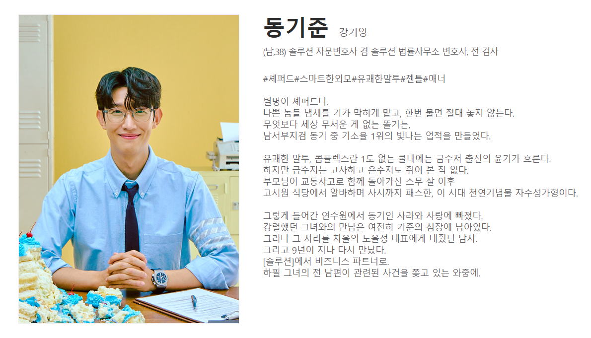동기준역은 배우 강기영님이 맡았으며 38세의 솔루션 자문변호사이자 전 검사출신의 인물입니다. 자수성가한 인물로 뛰어난 능력과 경력이 있으며 똘끼가 가득한 겁없는 캐릭터입니다.