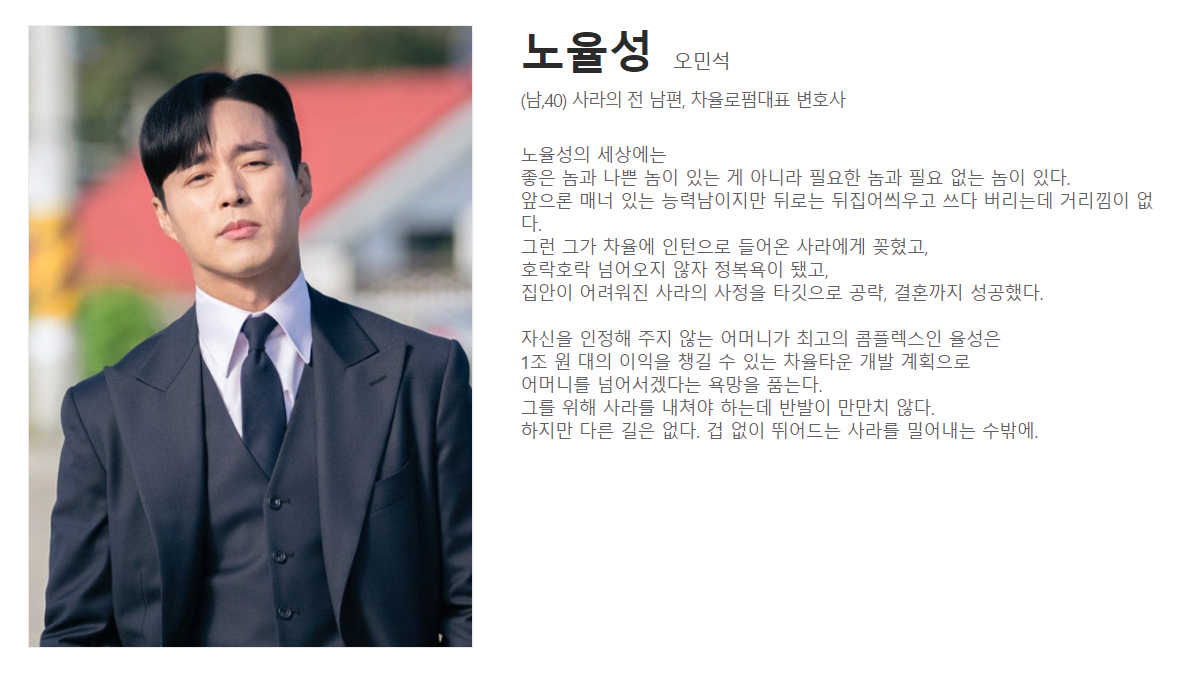 메인 빌런 캐릭터라고 볼수 있는 노율성 역할은 배우 오민석님이 맡았으며 40세로 사라의 전남편이자 차율로펌대표 변호사입니다.