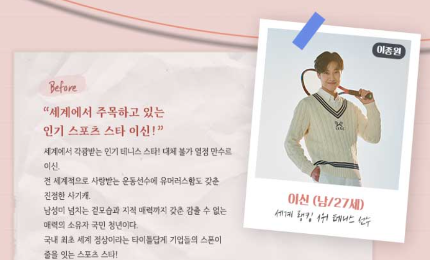 이종원: 이신 역(남, 27세) - (아역: 조이현) - 세계 랭킹 1위 테니스 선수