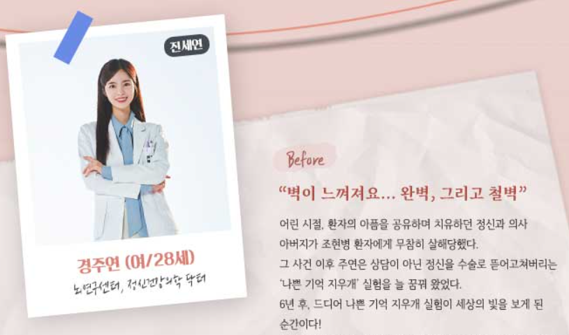 어린 시절 아버지의 죽음을 목격한 트라우마로 인해 경주연은 사람의 마음을 치료하는 상담 대신 정신을 수술로 바로잡는 '나쁜 기억 지우개' 실험에 몰두합니다. 6년간의 노력 끝에 실험에 성공하지만, 그 과정에서 냉철하고 차가운 완벽주의자로 변해버립니다.