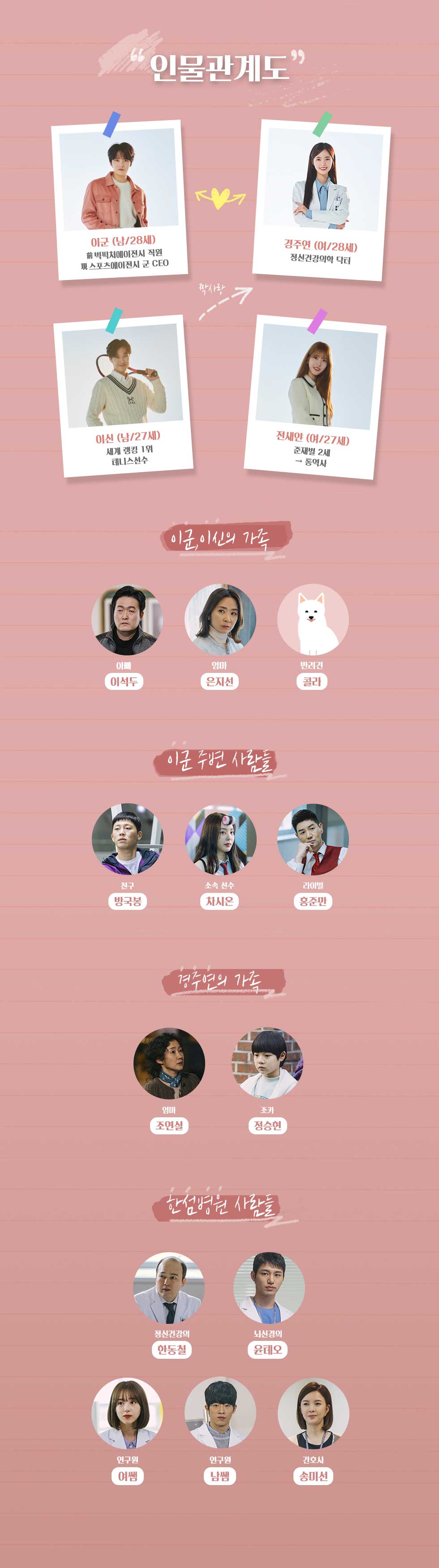 이외에 이군, 이신의 가족과 경주연네 가족 그리고 병원 사람들, 에이전시 관련 인물등이 등장합니다.