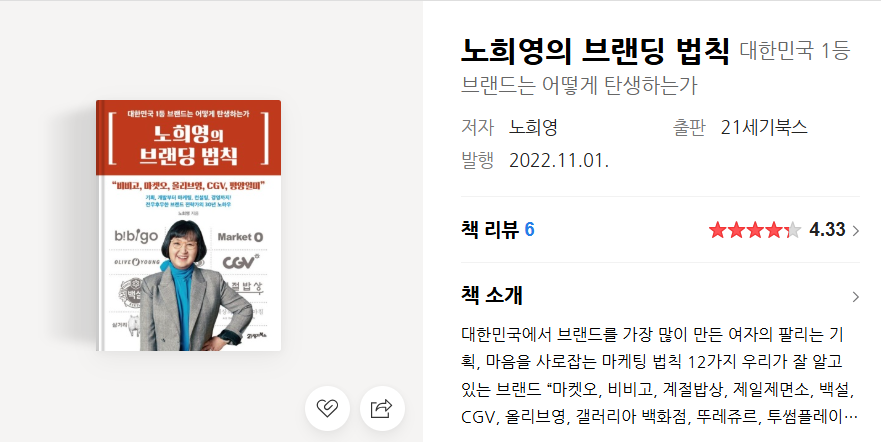 대표적인 저서는 자신의 브랜딩 노하우를 담은 책 노희영의 브랜딩 법칙입니다. 이 책은 대한민국 1등 브랜드는 어떻게 탄생하는가에 대한 답을 제시하며, 노희영 님이 30년 넘게 쌓아온 브랜딩 철학과 실전 노하우를 담고 있습니다.