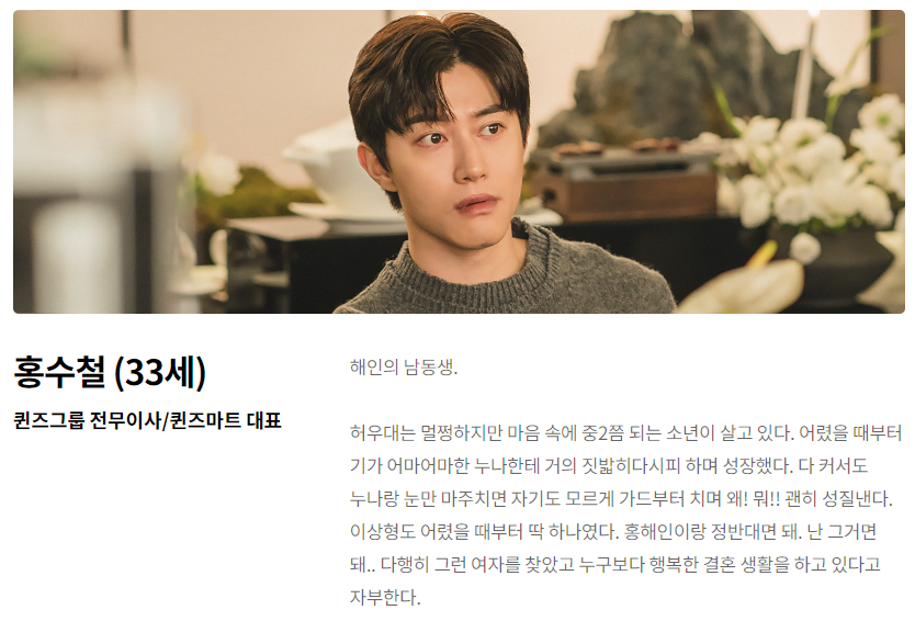 홍수철역은 배우 곽동연님이 맡았으며 해인의 남동생이자 33세의 퀸즈그룹의 전무이사이자 마트 대표입니다.