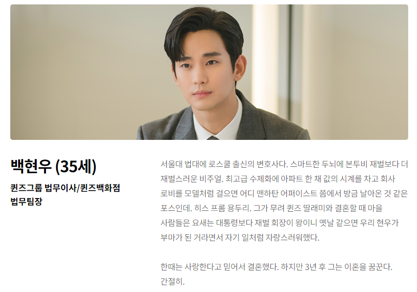 가장 메인 캐릭터라고 할수 있는 백현우역은 배우 김수현님이 맡았으며 35세의 퀸즈구룹 법무이사이자 백화점 법무팀장의 역할입니다.