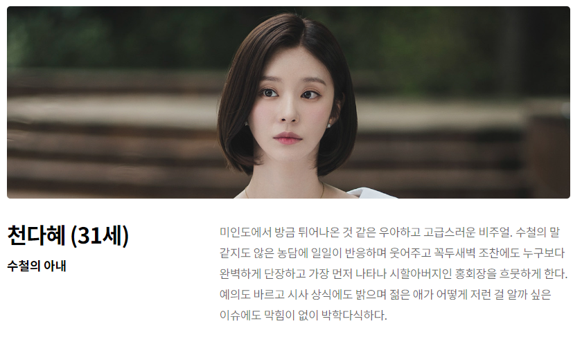 천다혜역은 배우 이주빈님이 맡았으며 수철의 아내이며 31세의 우아한 외모의 소유자입니다. 이것저것 아는 것이 많으며 예의도 바르고 상대방을 잘 맞춰주기도 하며 잘 상대하는 인물입니다.