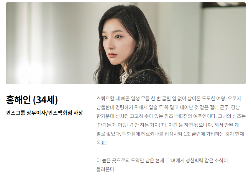 홍해인역은 배우 김지원님이 맡았으며 34세의 퀸즈그룹 상무이사이자 백화점사장입니다. 퀸즈 그룹은 대한민국 재계를 꽉 잡고 있습니다.