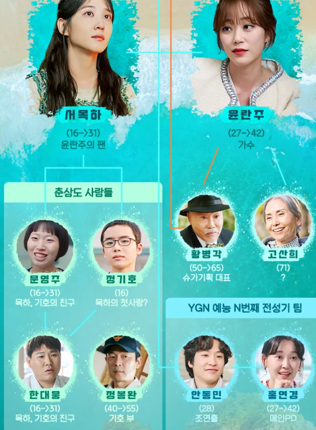 또 다른 등장인물로는 RJ엔터 대표 이서준역할의 배우 김주헌님. 은모래 역할의 배우 배강희님등이 출연하며 N번째 전성기팀과 춘삼도 사람들의 등장인물들이 등장하게 됩니다.