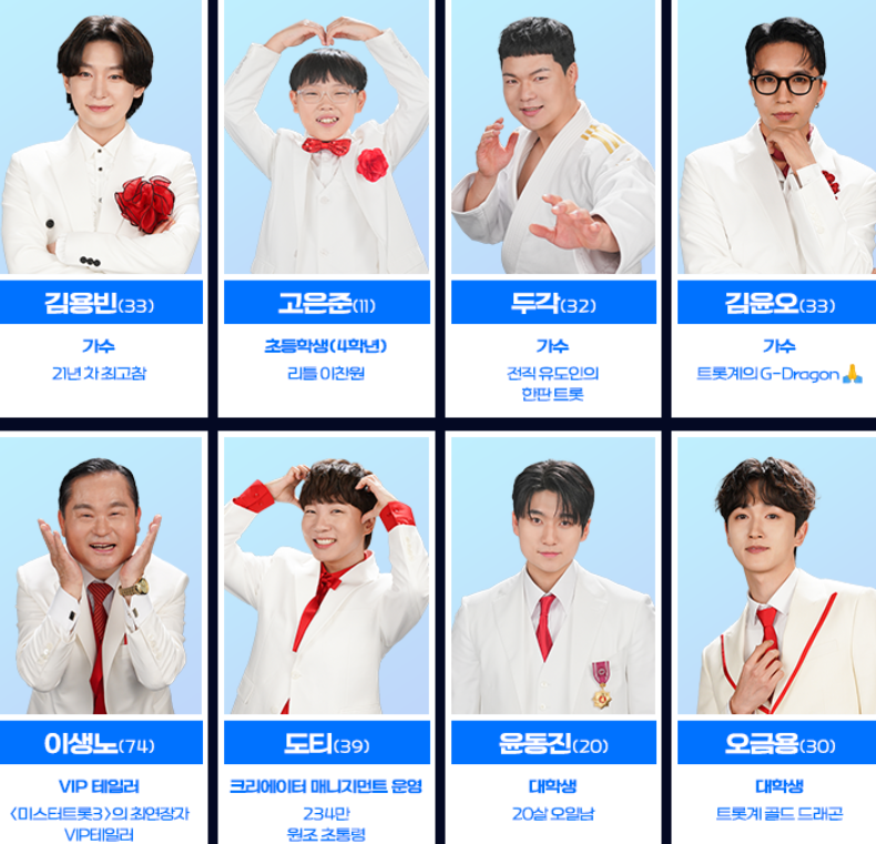 최연소 참가자인 8살 유지우는 뛰어난 가창력과 깜찍한 무대 매너로 시청자들의 마음을 사로잡을 것으로 예상되며, 최고령 참가자인 74세 이생노는 연륜에서 묻어나는 깊은 감성과 뛰어난 가창력으로 감동적인 무대를 선사할 것으로 기대됩니다.