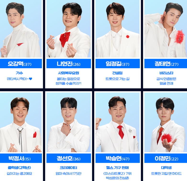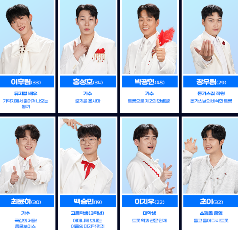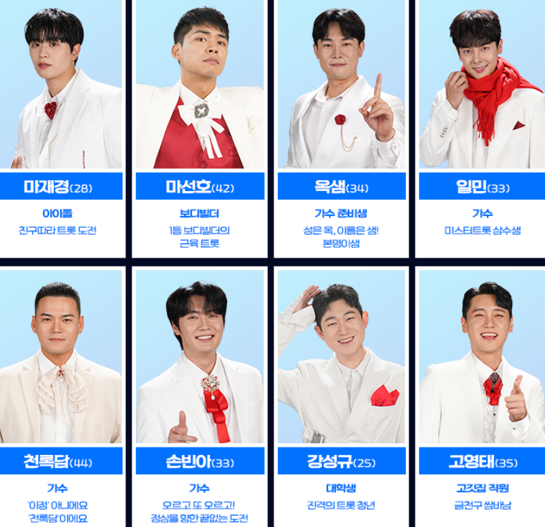 또한 불타는 트롯맨 출신 참가자들도 다수 참여하여 다양한 트로트 오디션 프로그램 경험자들의 치열한 경쟁이 예상됩니다.