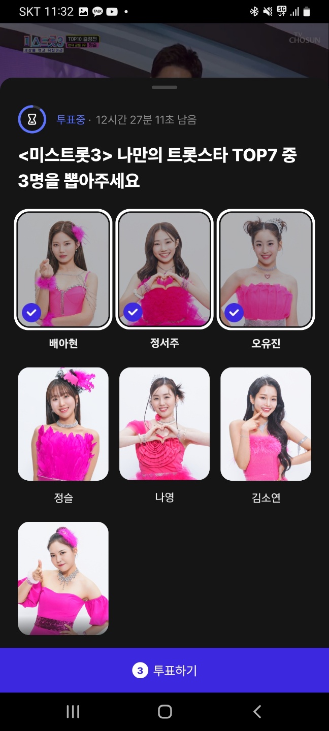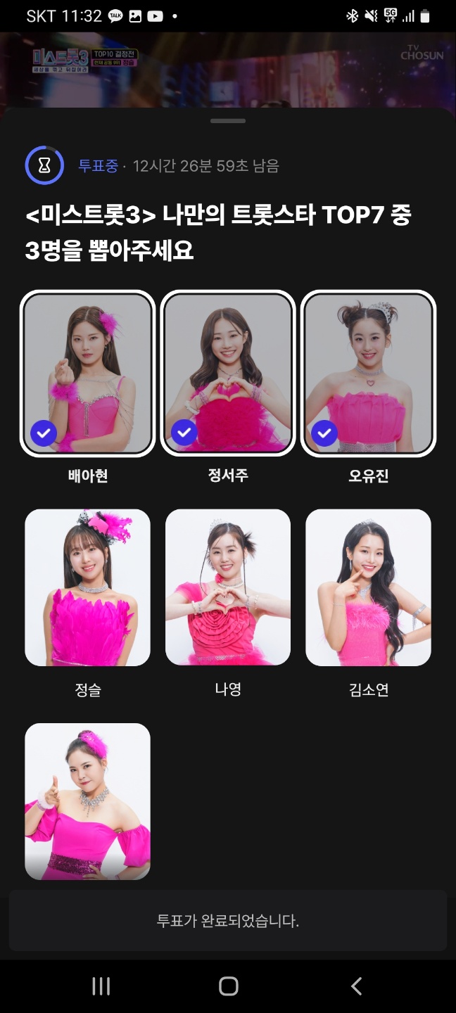이후 응원하고 싶은 참가자 7명중 3명을 선택하신 후에 투표하기 버튼을 누르시면 최종 완료됩니다. 네이버 계정당 1일 1회만 참여만 가능하치 참고하시기 바랍니다.