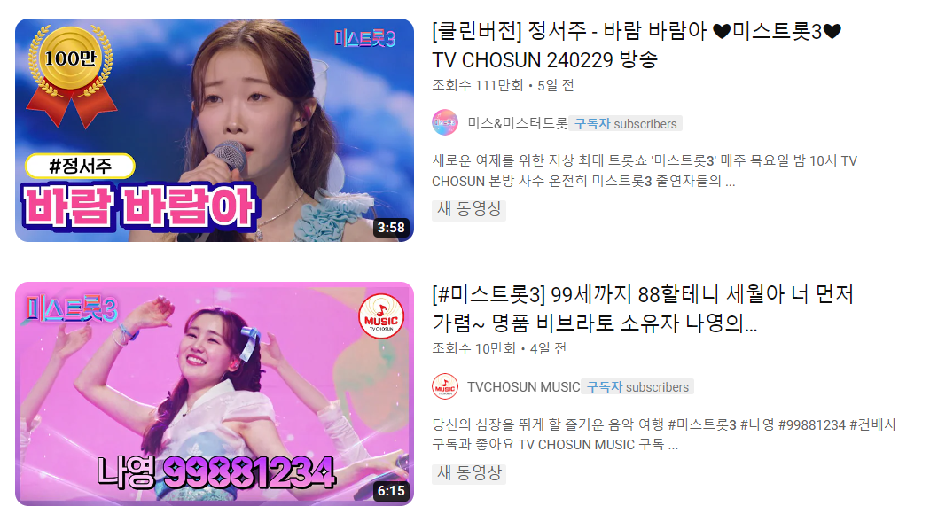 특히 정서주의 바람 바람아, 나영의 99881234, 배아현의 100일, 미스김의 홍실, 오유진의 예쁘잖아, 김소연의 오케이, 정슬의 사랑학개론등이 트로트 차트 상위권에 위치하고 있습니다.
