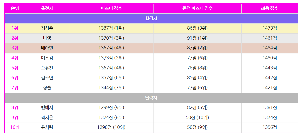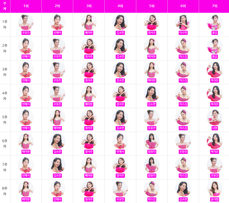 또한 8위 빈예서, 9위 곽지은, 10위 윤서령이 차지하며 안타깝게 탈락을 하게 되었습니다. 이제 대망의 결승전에서는 톱7이 대망의 진 자리를 두고 최종 무대를 남겨둔 상황입니다.