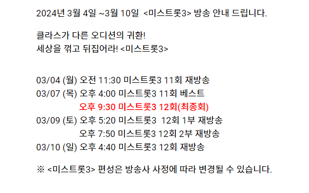 한 회도 빠지지 않고 시청을한 애청자라고 밝힌 이미자님은 내내 흐뭇하게 보았다며 큰 만족감을 드러내기도 하였습니다. 미스트롯3 최종 결승전은 3월 7일 평소보다 30분 앞 당겨진 밤 9시 30분 방송됩니다.