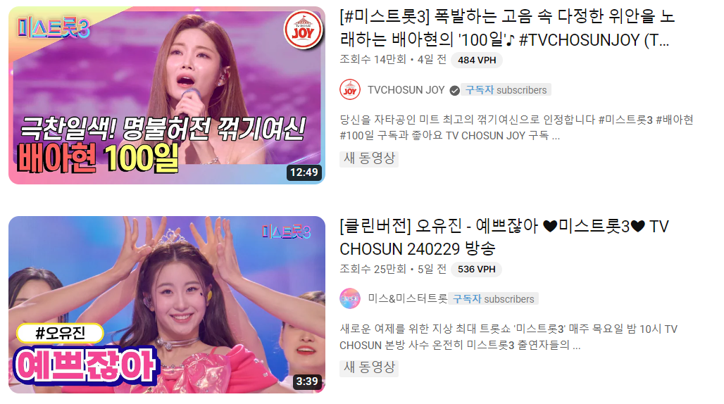 특히 정서주의 바람 바람아, 나영의 99881234, 배아현의 100일, 미스김의 홍실, 오유진의 예쁘잖아, 김소연의 오케이, 정슬의 사랑학개론등이 트로트 차트 상위권에 위치하고 있습니다.