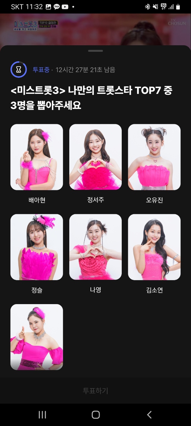이후 응원하고 싶은 참가자 7명중 3명을 선택하신 후에 투표하기 버튼을 누르시면 최종 완료됩니다. 네이버 계정당 1일 1회만 참여만 가능하치 참고하시기 바랍니다.