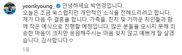 지난 21일 박연경 아나운서는 결혼 소식을 발표한바 있습니다. 자신의 인스타그램에 올린 소식에 따르면 쑥스럽지만 개인적인 소식을 전한다며 다음주 결혼을 한다고 밝혔습니다.