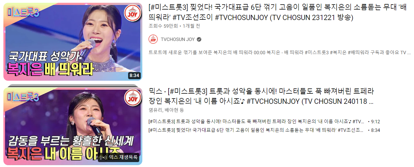 또한 새싹부에서 복지은님이 선을 한번 차지한 이력도 있어서 앞으로 트로트 무대와 가수 활동 또한 기대하게 만들었습니다.