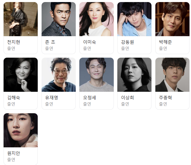 주요 출연진으로는 전지현, 강동원, 박해준, 이미숙, 김해숙, 오정세, 유재명, 존 조 등 국내외 유명 배우들이 대거 참여해 작품의 무게감을 더했습니다.