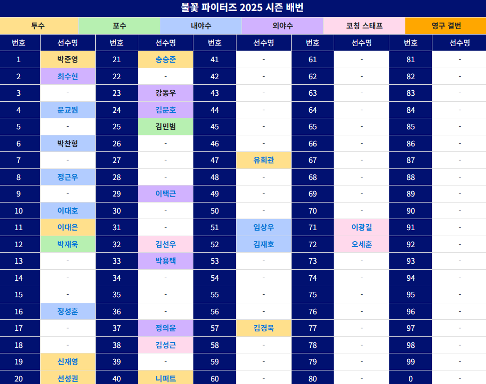 이 외에도 불꽃야구단에는 무한한 잠재력을 지닌 젊은 선수들이 다수 합류하여 팀의 미래를 밝히고 있습니다. 불꽃야구는 오랜 프로 경험을 가진 베테랑 선수들의 노련함과 패기 넘치는 신예 선수들의 열정이 하나 되어 최고의 팀워크를 만들어나갈 것입니다.