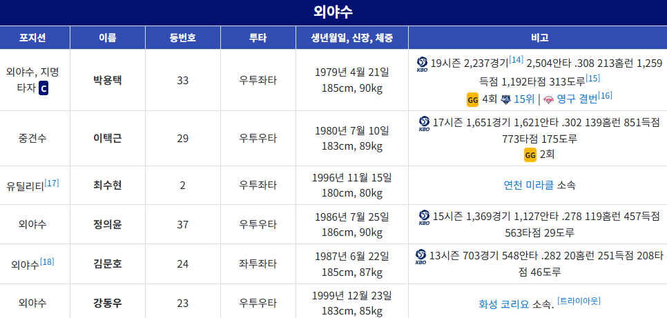 외야에는 이택근, 정의윤, 김문호, 최수현 선수가 빠른 발과 넓은 수비 범위를 바탕으로 팀에 활력을 불어넣을 것입니다. 포수진은 박재욱 선수를 중심으로 팀의 안방을 든든하게 책임질 것입니다.