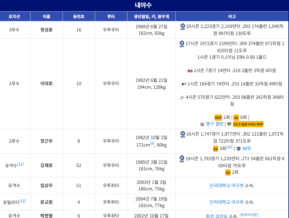 이들은 각자의 특색 있는 투구 스타일과 풍부한 경험을 바탕으로 팀의 승리에 기여할 것입니다. 내야진에는 박용택, 정성훈, 정근우, 이대호, 김재호 선수가 중심을 이루며 안정적인 수비와 클러치 상황에서의 해결 능력으로 팀을 이끌어갈 것입니다.