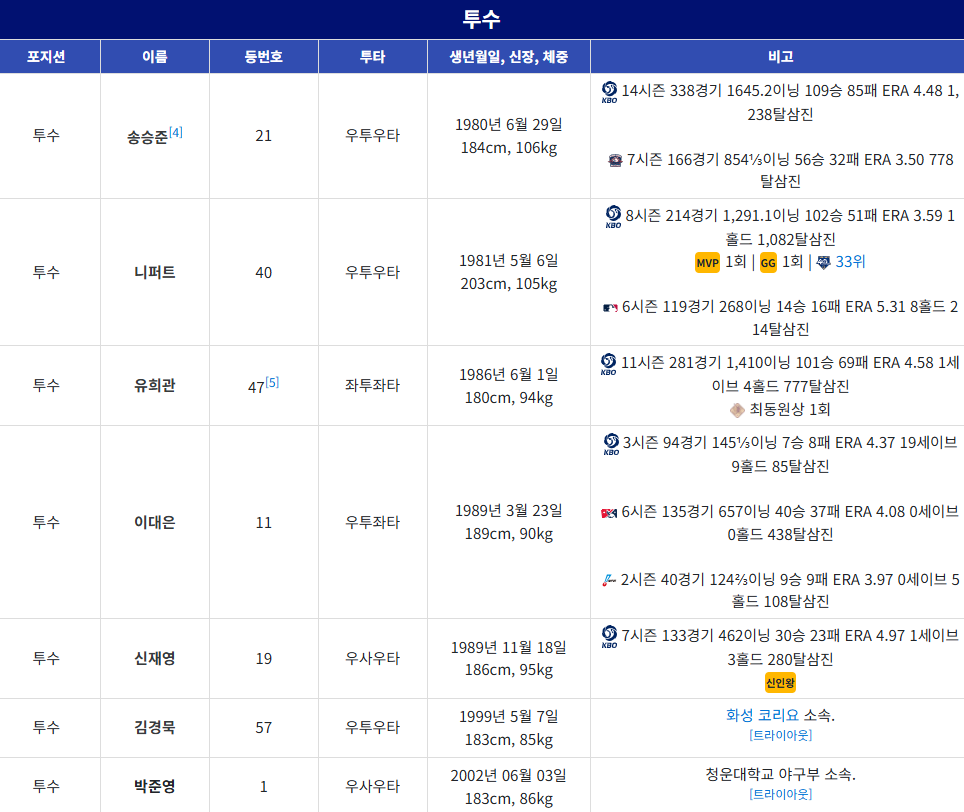 마운드를 든든하게 지킬 투수진에는 송승준, 더스틴 니퍼트, 유희관, 이대은, 신재영, 선성권, 김경묵, 강동우, 박준영, 박찬형, 임상우, 김민범, 문교원 선수가 포진해 있습니다.