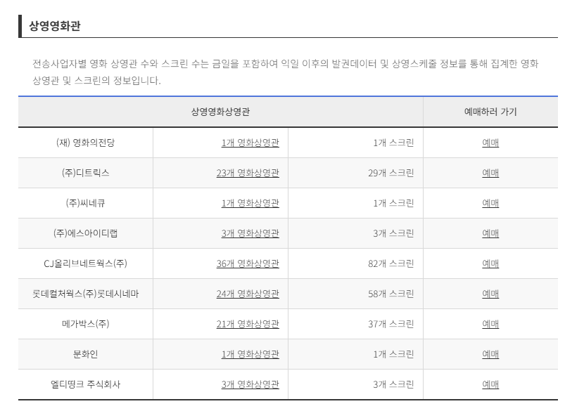 또 대관이나 단체 관람을 원할 경우 해당 극장 고객센터에 문의해 예약할 수 있습니다. 실시간 예매율과 관객 수 등 자세한 정보는 한국영화진흥위원회의 영화관 입장권 통합전산망에서 확인 가능합니다.