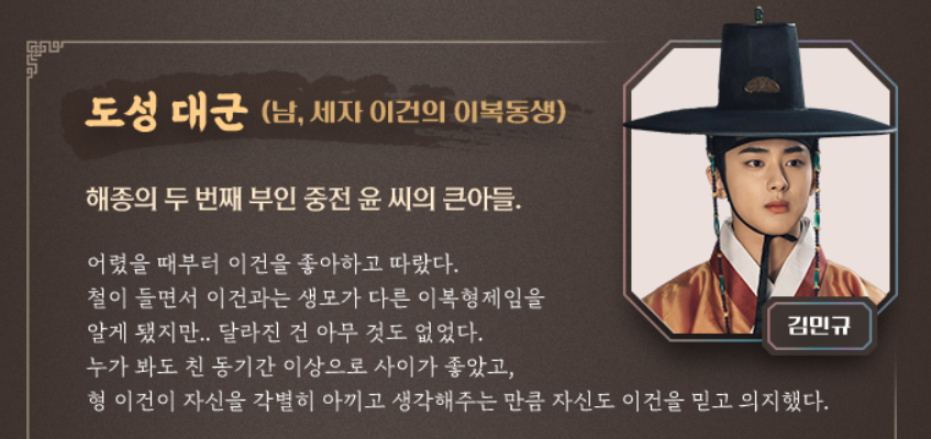 도성 대군역은 배우 김민규가 담당합니다. 마에스트라 이후로 3개월만의 복귀작입니다. 세자 이건의 이복 동생이자, 해종의 두 번째 부인 중전 윤 씨의 큰 아들로 등장합니다.